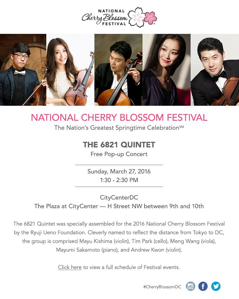 A special group of five talented performers have come together just for the National Cherry Blossom Festival to share their exquisite music with the city of DC, with the support of the Ryuji Ueno Foundation. The 6821 Quintet is cleverly named after the distance in miles from Tokyo to Washington, and their individual skills synchronized together provides the ultimate musical experience. The 6821 Quintet has a scheduled performance at the Opening Ceremony, they also have several pop-up performances planned throughout the city. On Sunday, March 27 from 1:30 PM – 2:30 PM, The 6821 Quintet will perform at CityCenter DC and on Monday, March 28, at Union Station from noon – 1 PM and at Reagan National Airport from 4 PM – 5 PM.