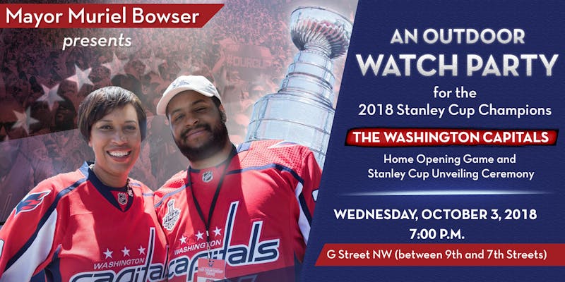 (WASHINGTON, DC) – On Wednesday, October 3, Mayor Bowser will join Monumental Sports & Entertainment to celebrate the 2018 Stanley Cup Champion Washington Capitals with an outdoor viewing party that includes a live broadcast of the championship banner raising ceremony and the first home game of the new season. To accommodate and include the broad and robust Capitals’ fan base in this event, the outdoor video board at G Street and 7th Street, NW will show the ceremony and game against the Boston Bruins.